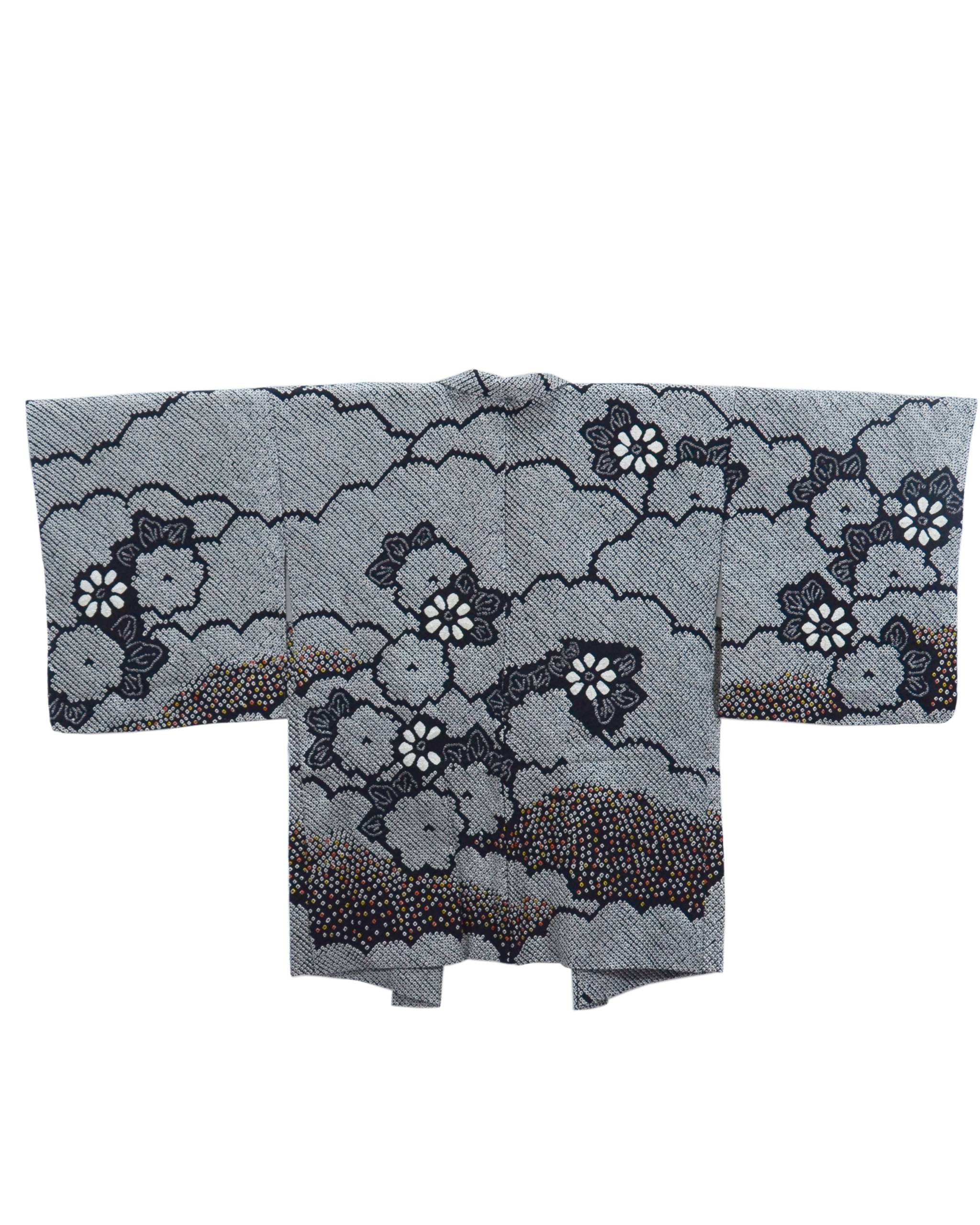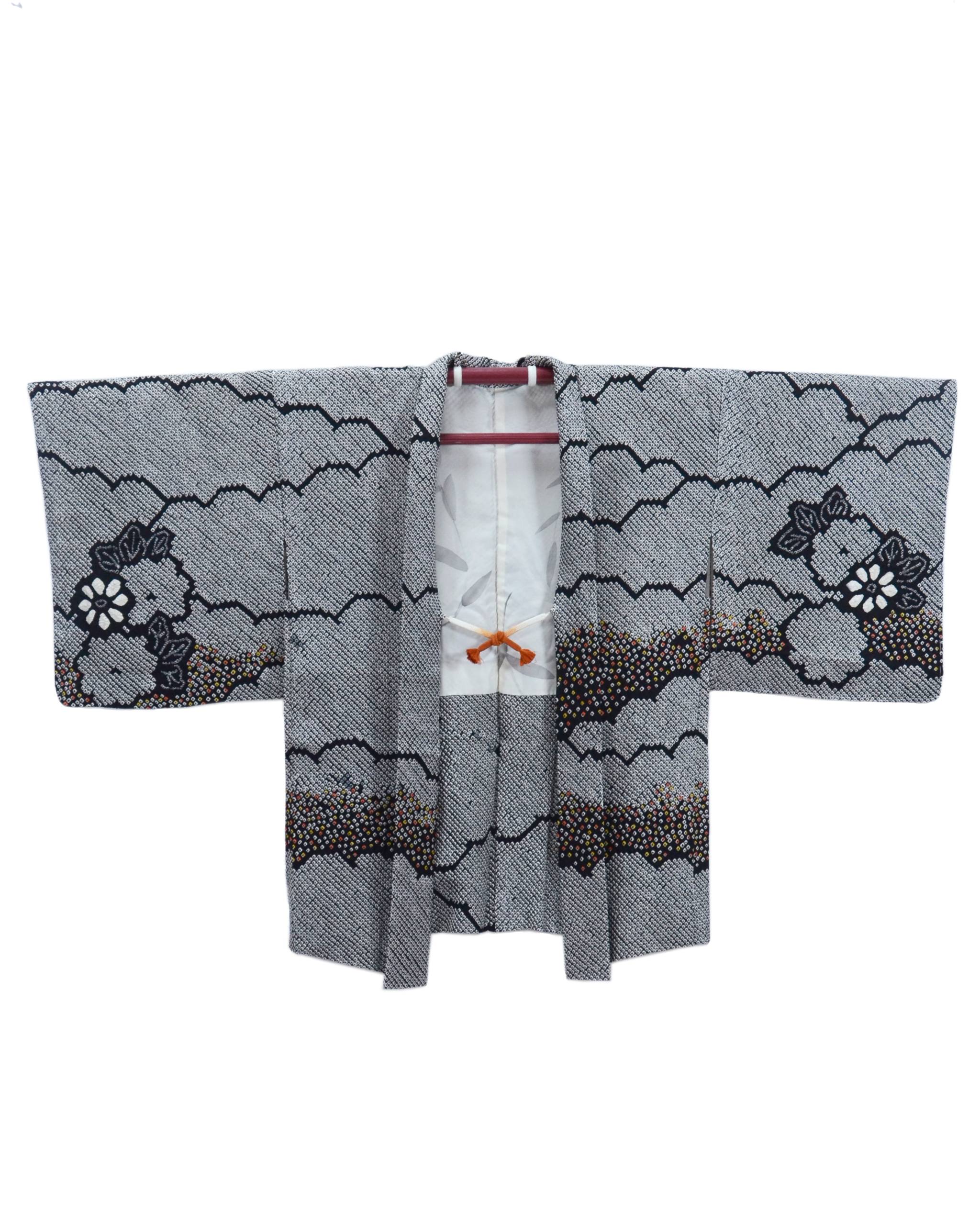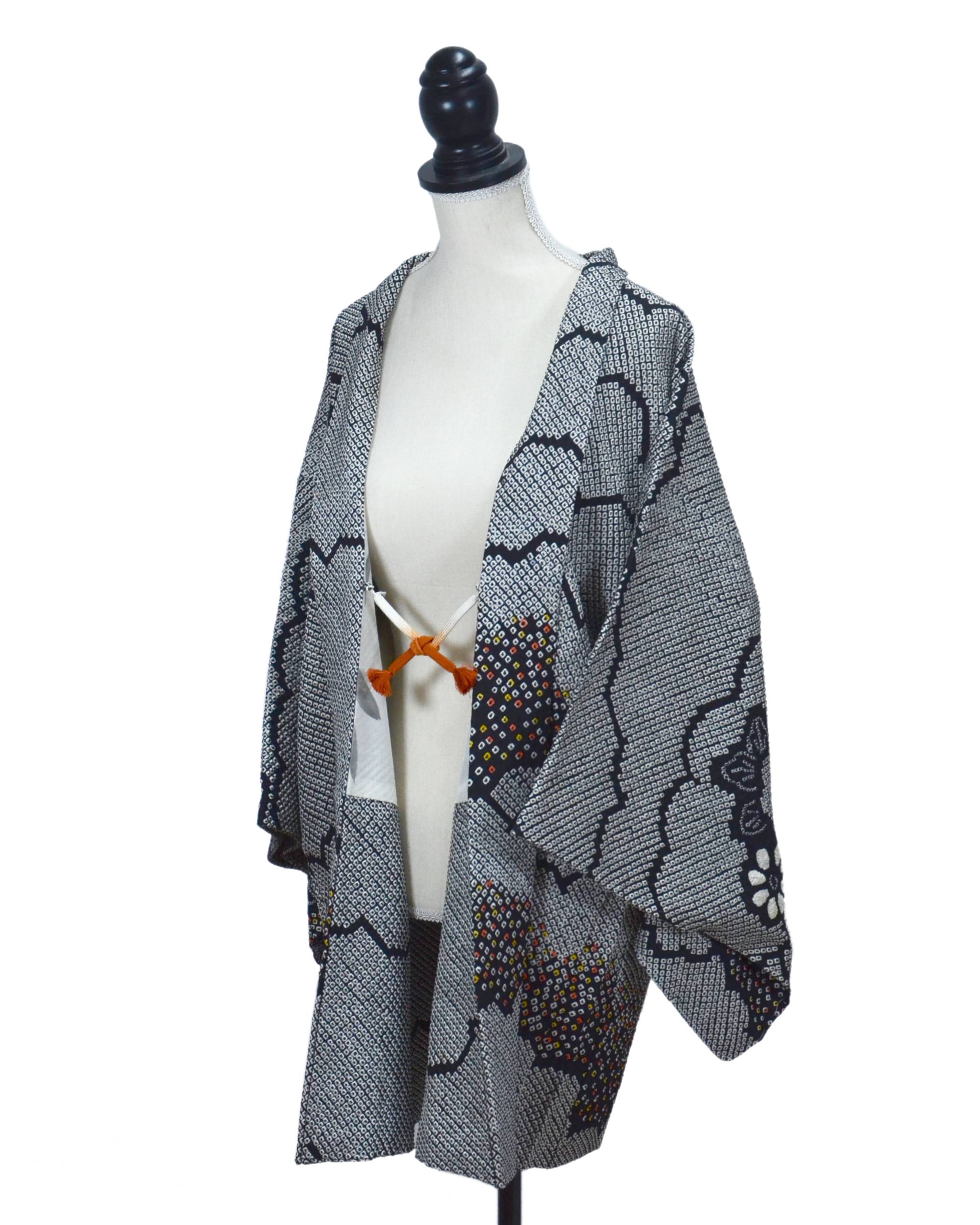 The haori, made of black fabric with a shibori pattern, is decorated with floral motifs in orange and yellow and looks very decorative.