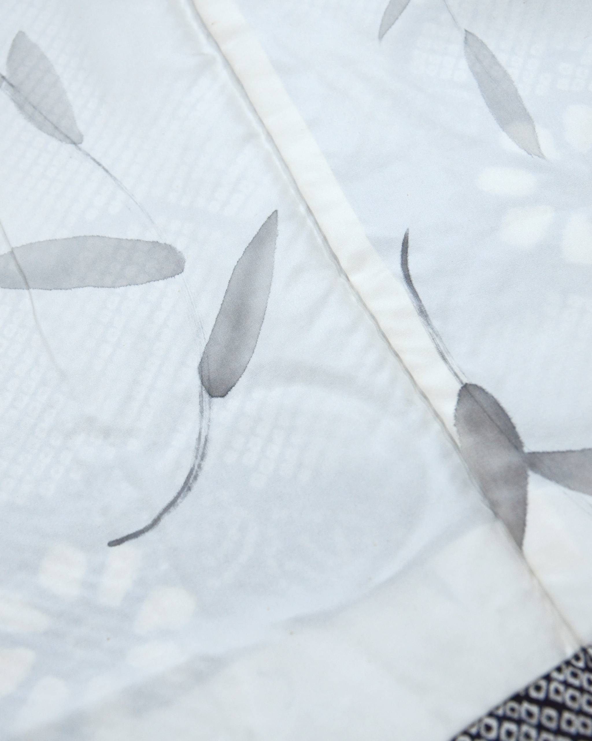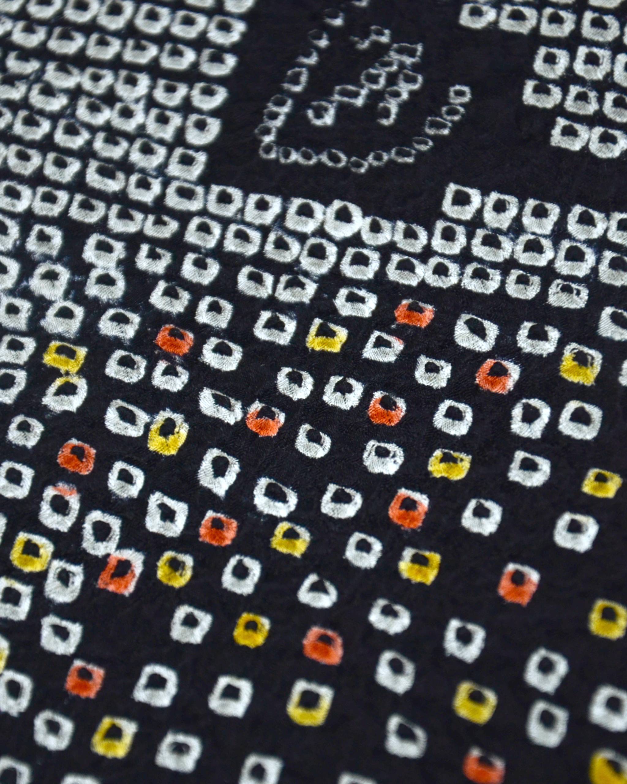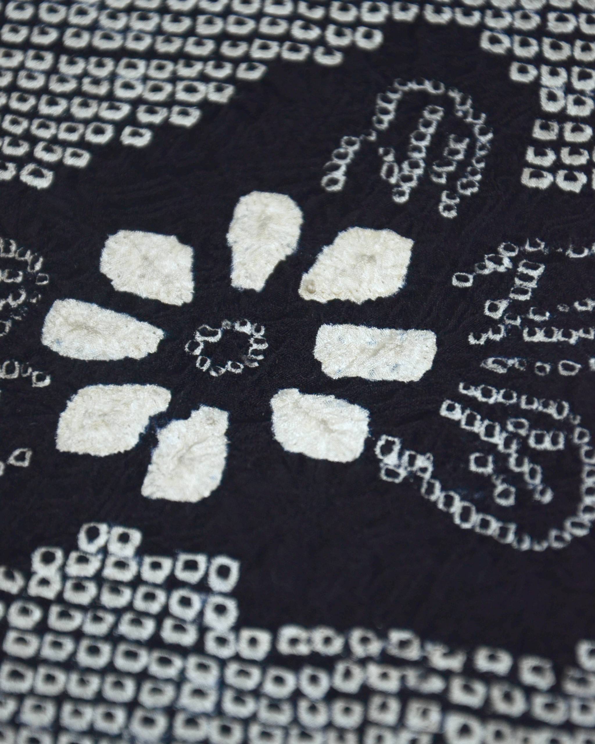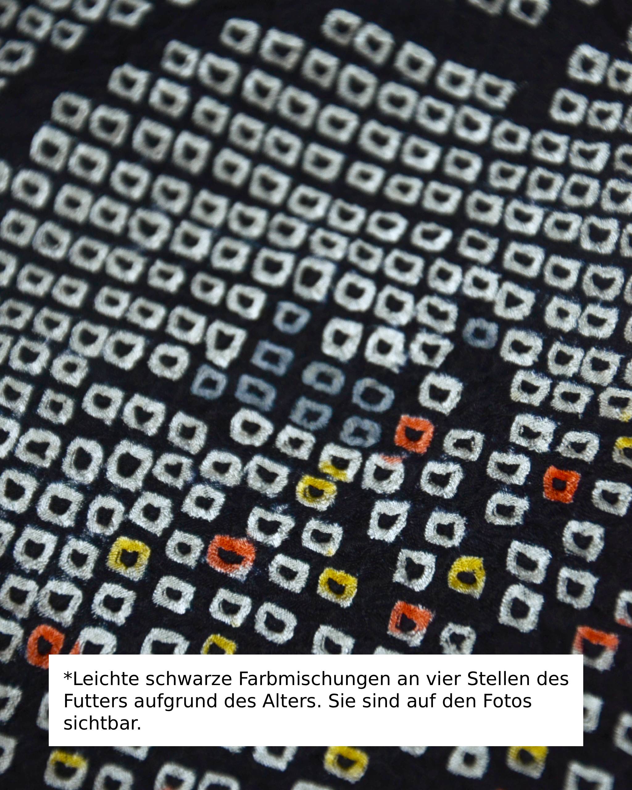 The haori, made of black fabric with a shibori pattern, is decorated with floral motifs in orange and yellow and looks very decorative.