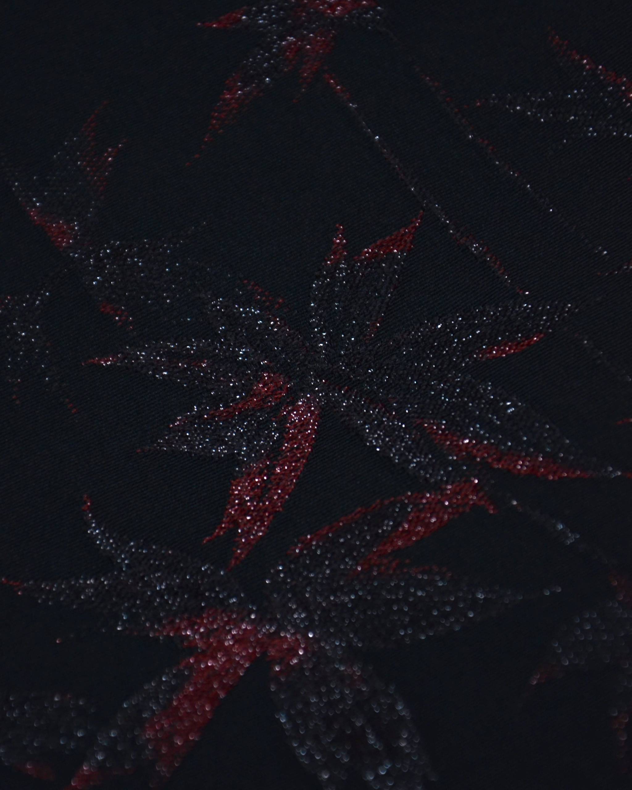 Black haori with shimmering red floral embroidery. A family crest is also featured in the embroidery, adding a particularly elegant...