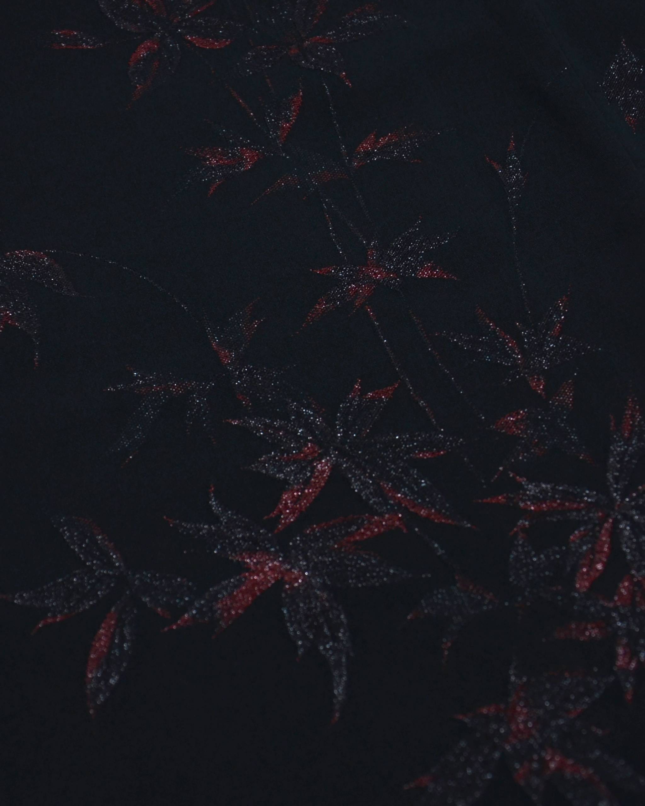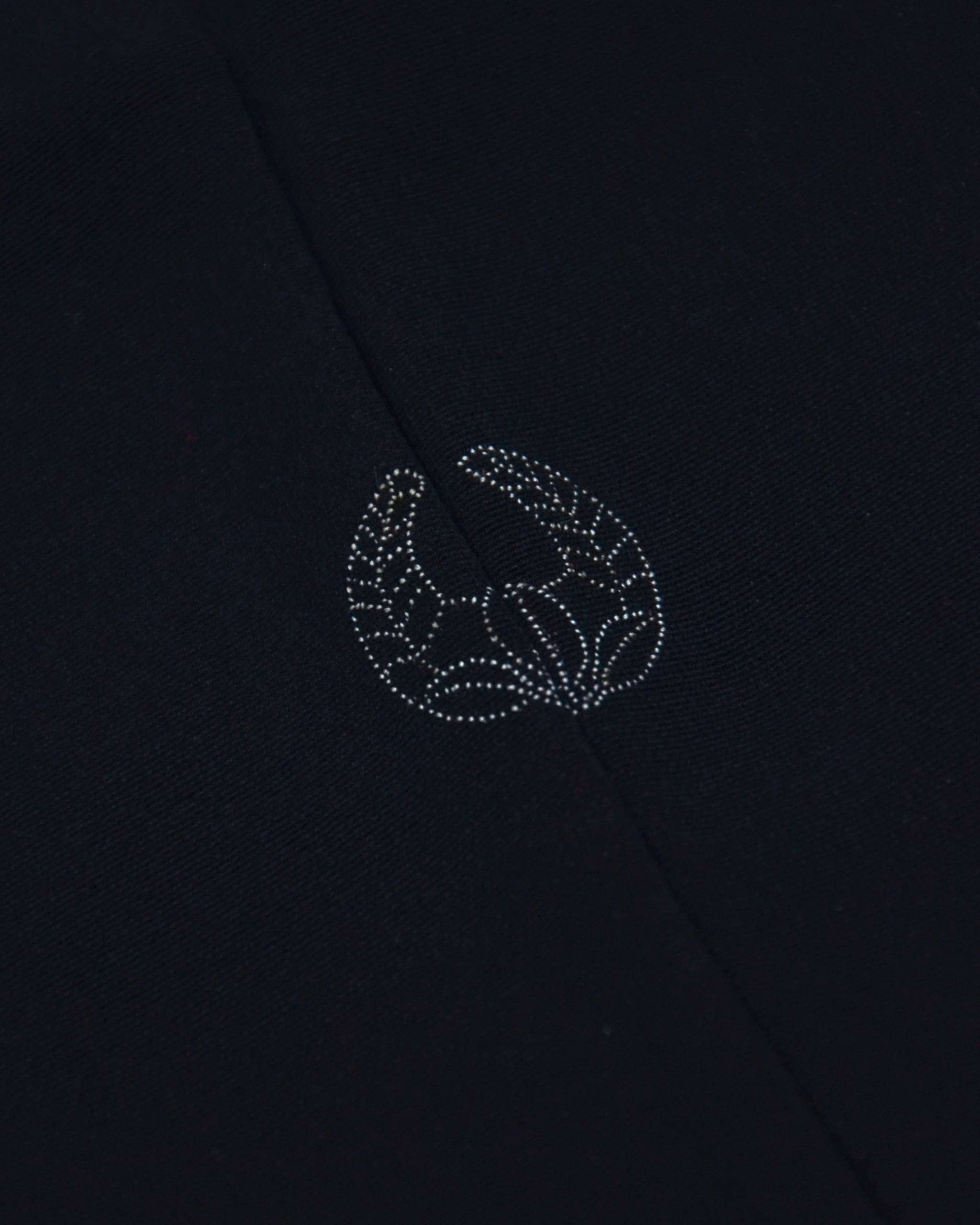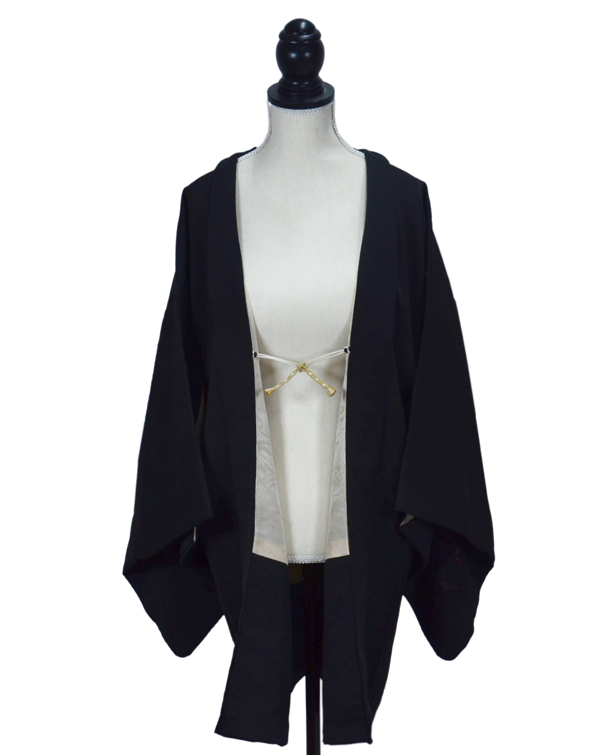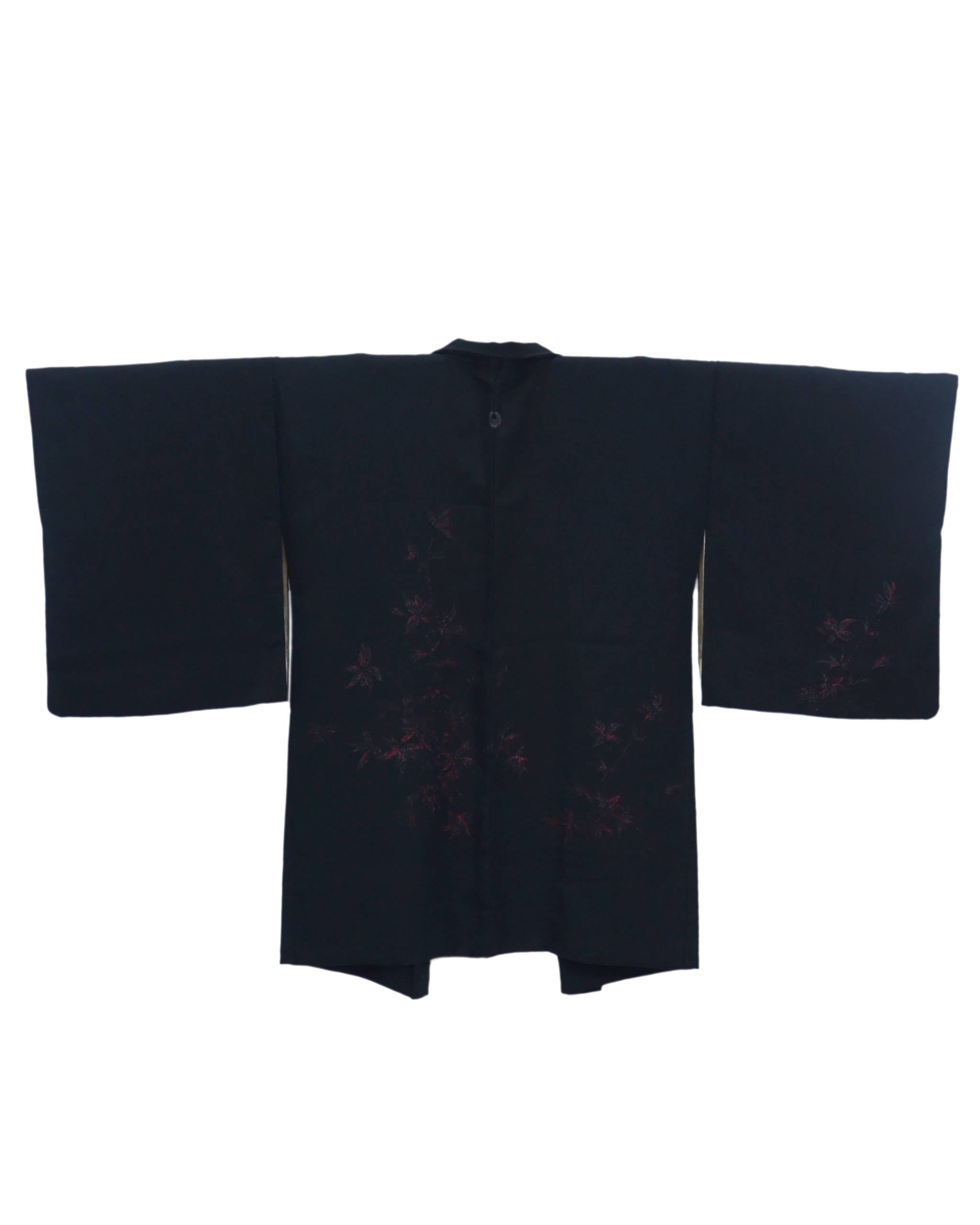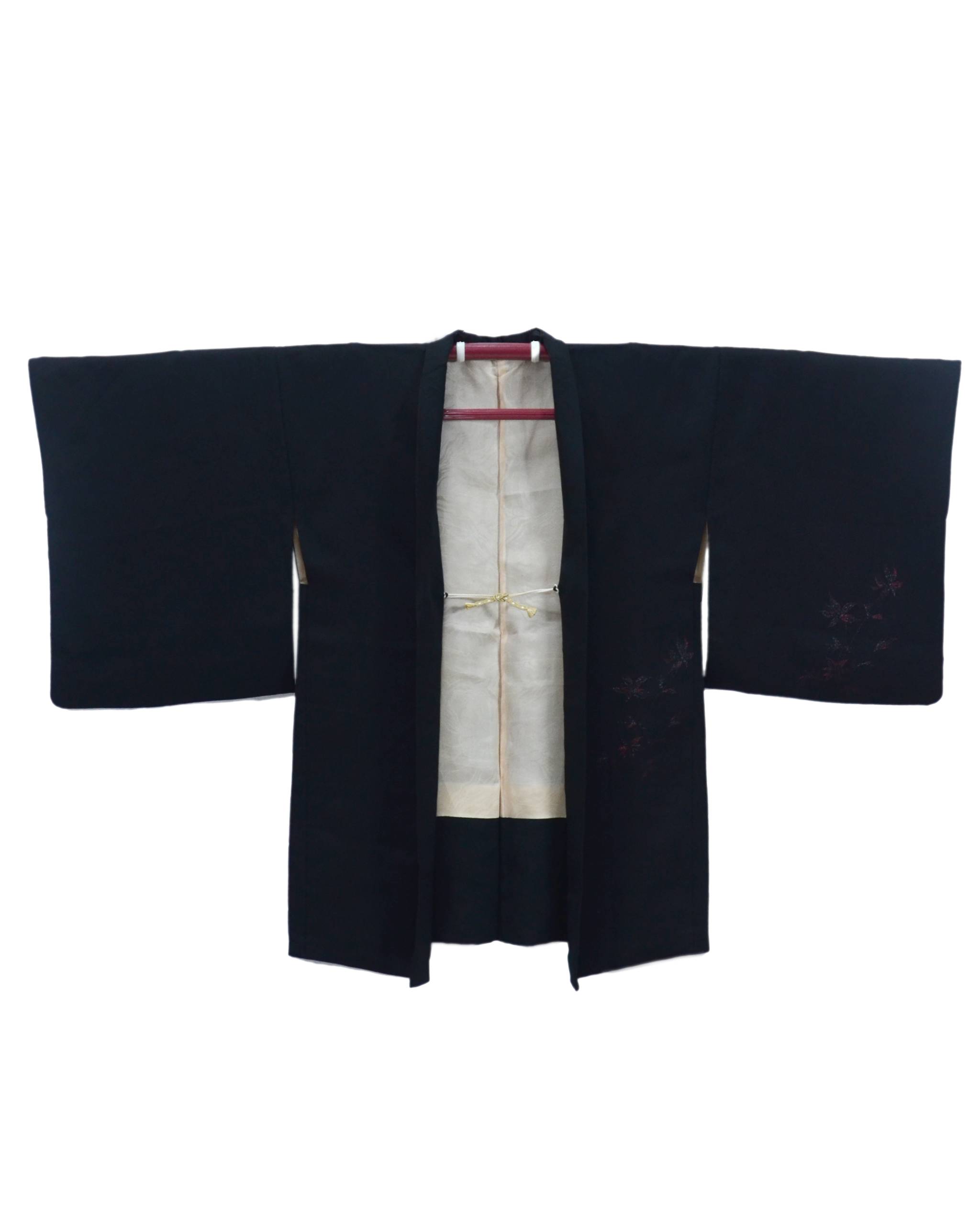 Black haori with shimmering red floral embroidery. A family crest is also featured in the embroidery, adding a particularly elegant and refined touch to the design. The lining is made of glossy silk fabric.