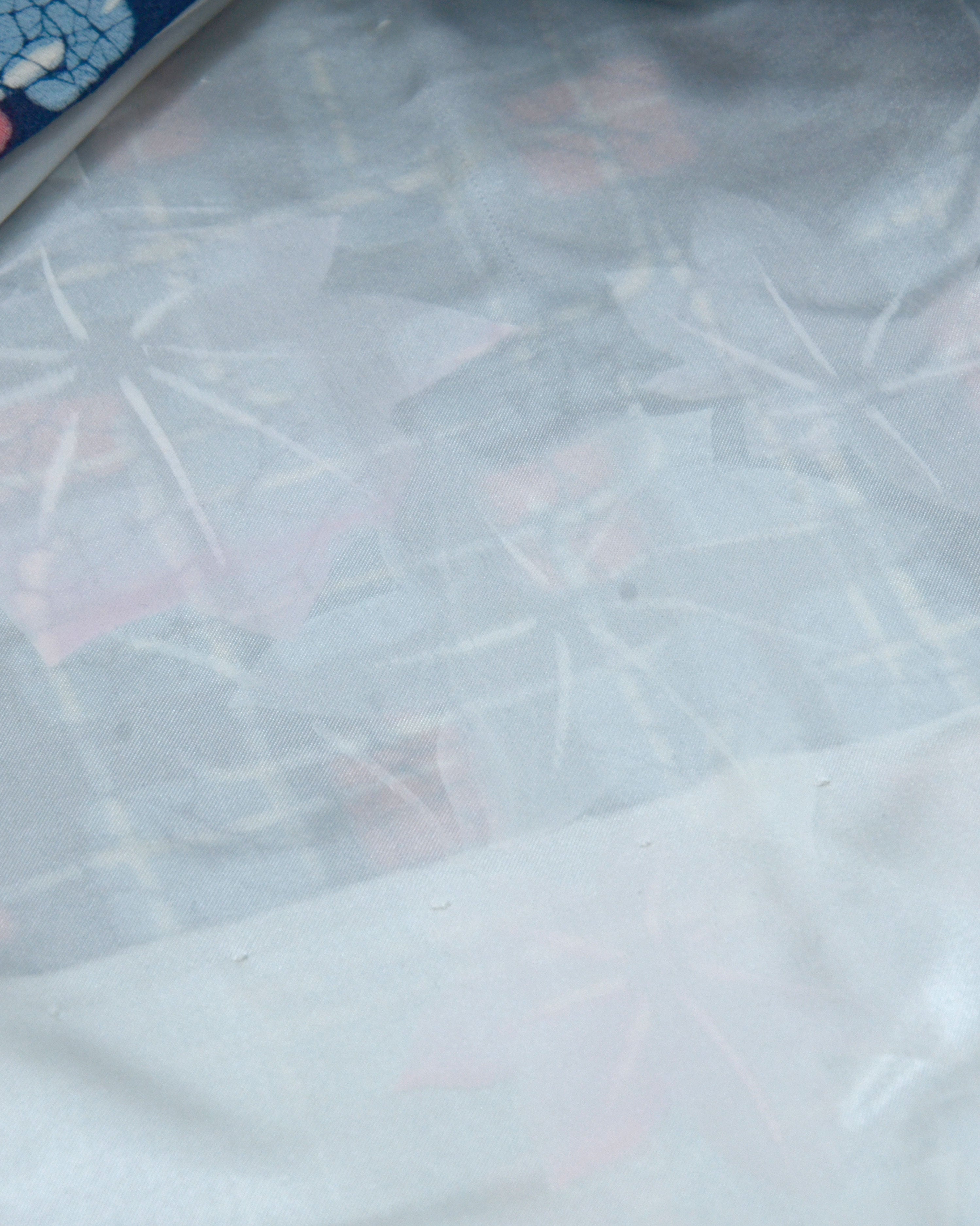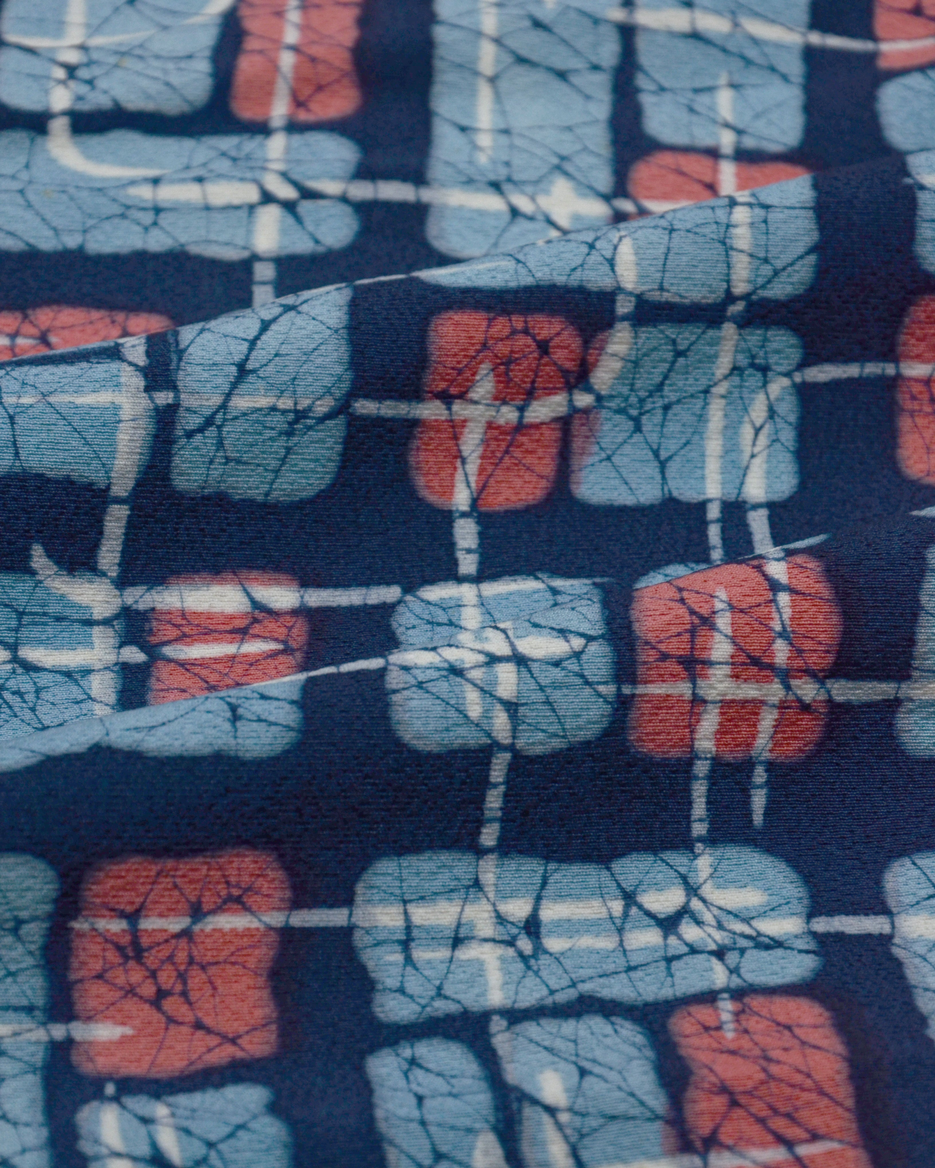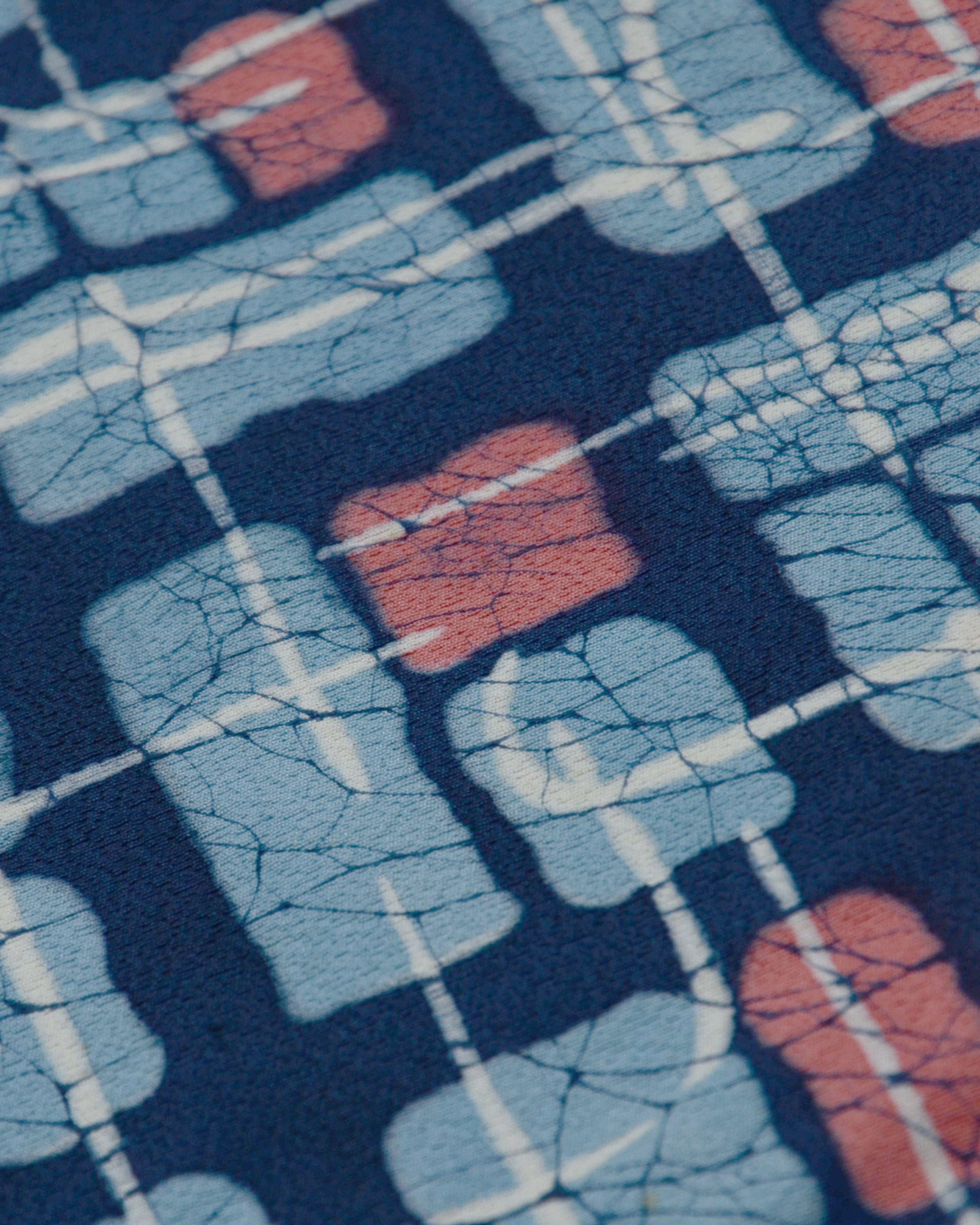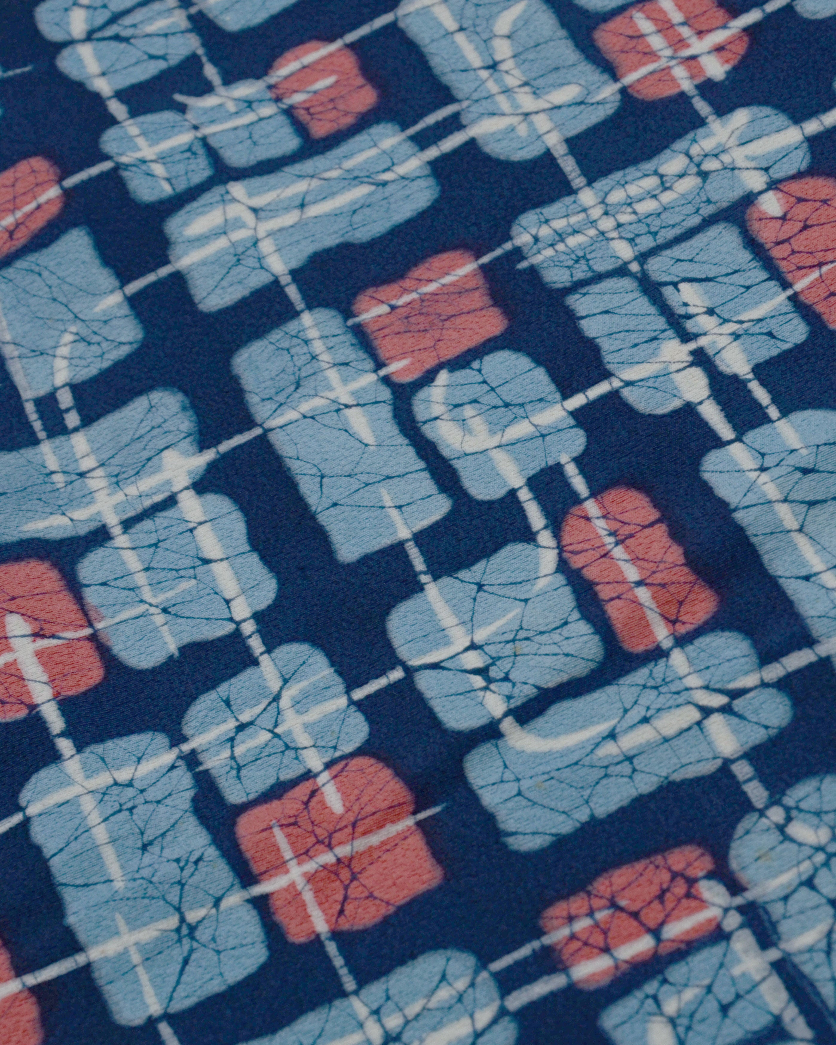 Das Muster in Blau, Hellblau und Rosa ist besonders ausdrucksstark und spiegelt den modernen Designgeist jener Epoche wider.