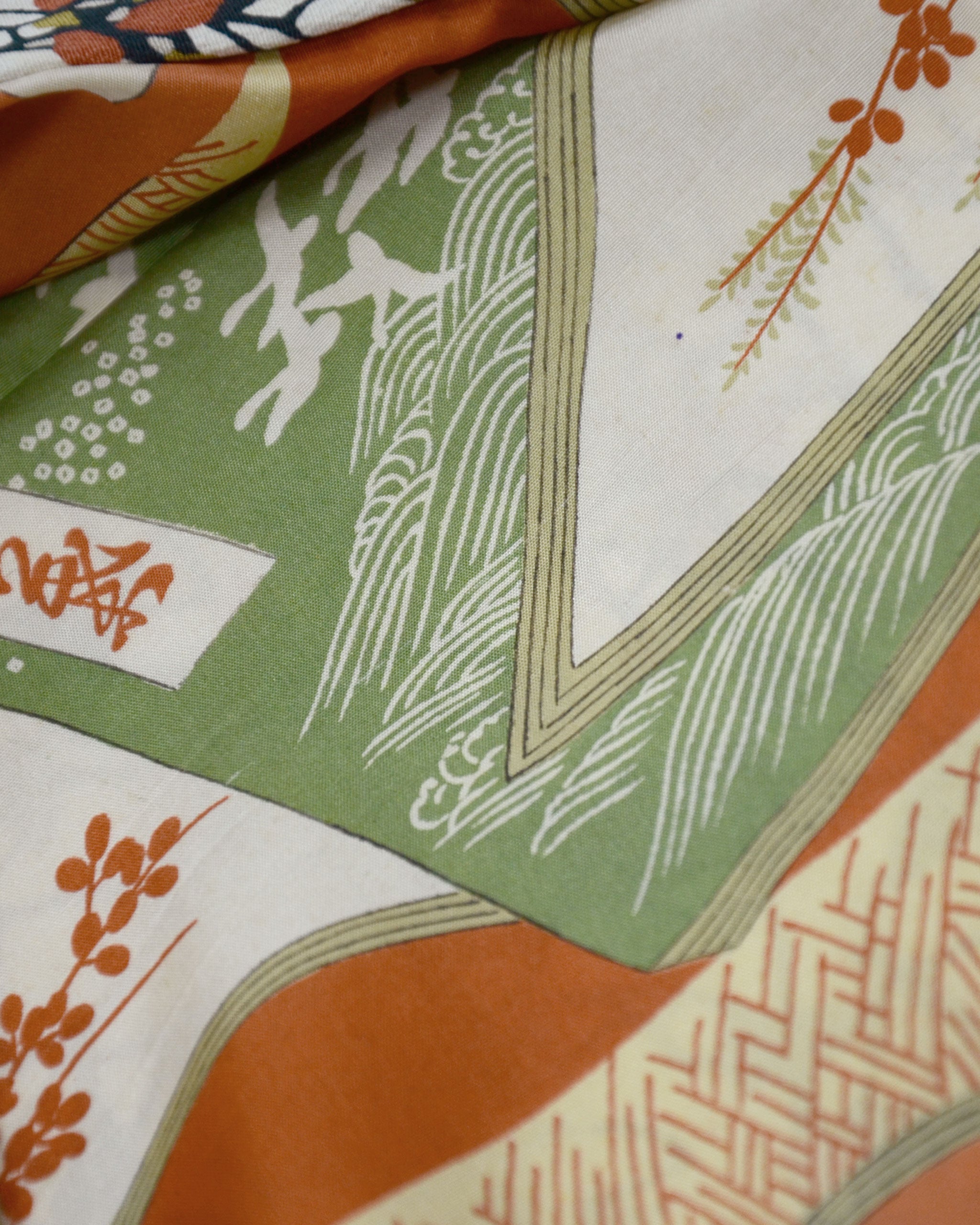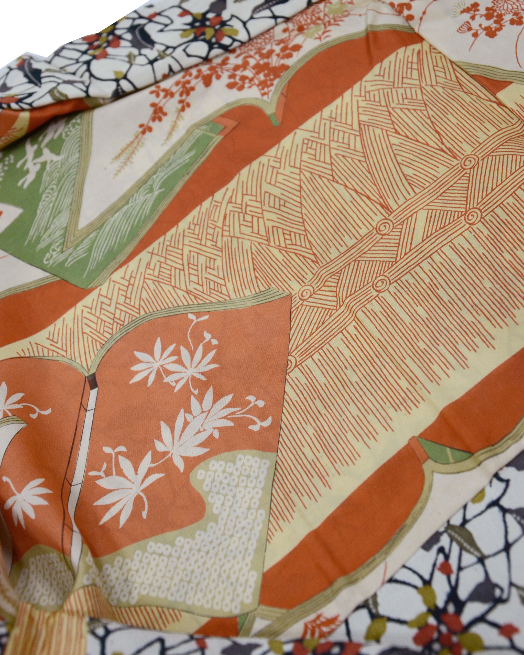 Dieser Haori besticht durch ein weißes Grundgewebe, auf dem kleine Früchte in einem lockeren Komon-Muster verteilt sind – ein lässiger, aber charmant verspielter Look. Das Futter ist mit alten Büchern illustriert, wobei die orange- und gelblichen Farbtöne wunderbar mit der Oberseite harmonieren und dem Haori einen besonders niedlichen Akzent verleihen. Der Zustand ist sehr gut, und er eignet sich perfekt für den Alltag und legere Outfits.