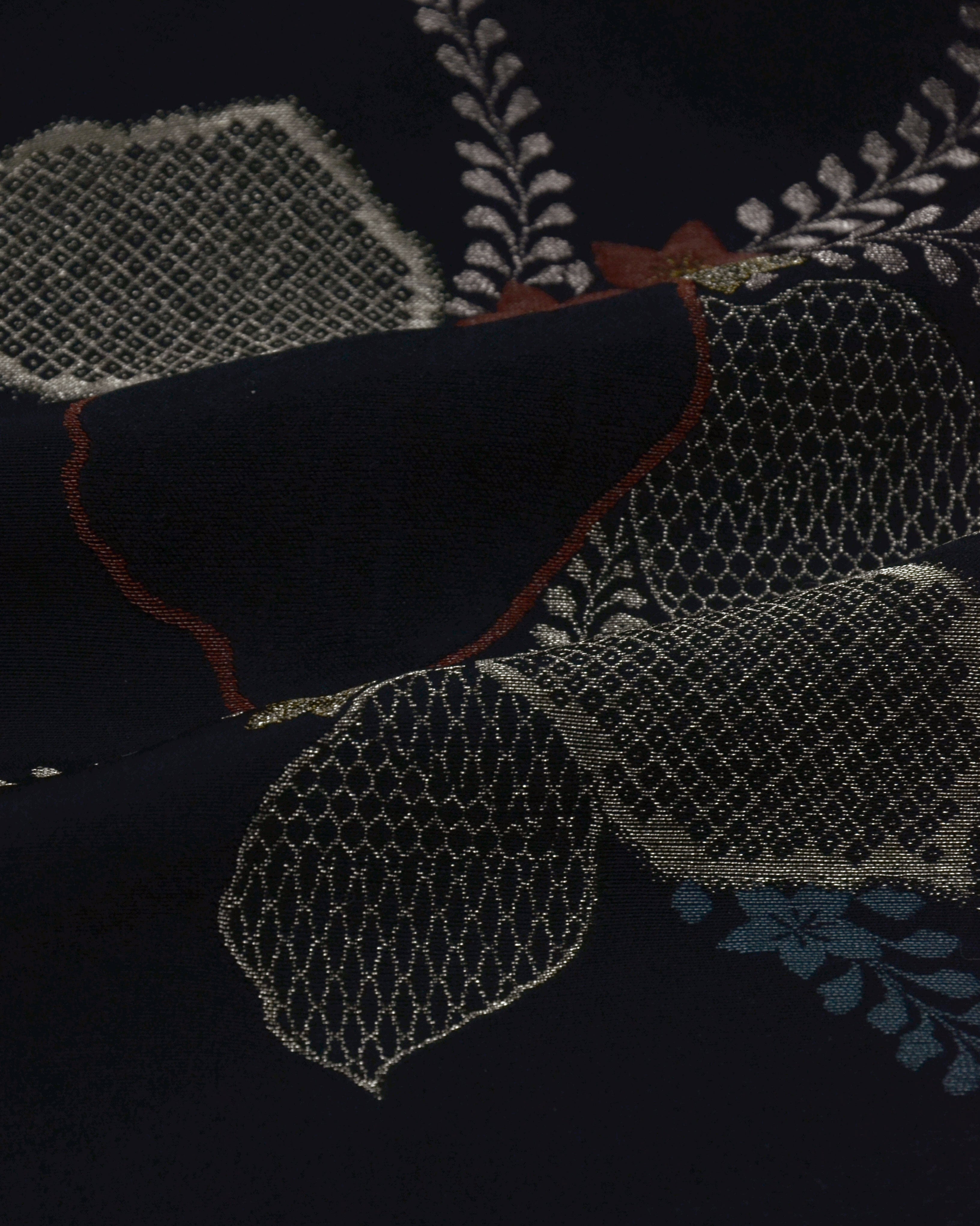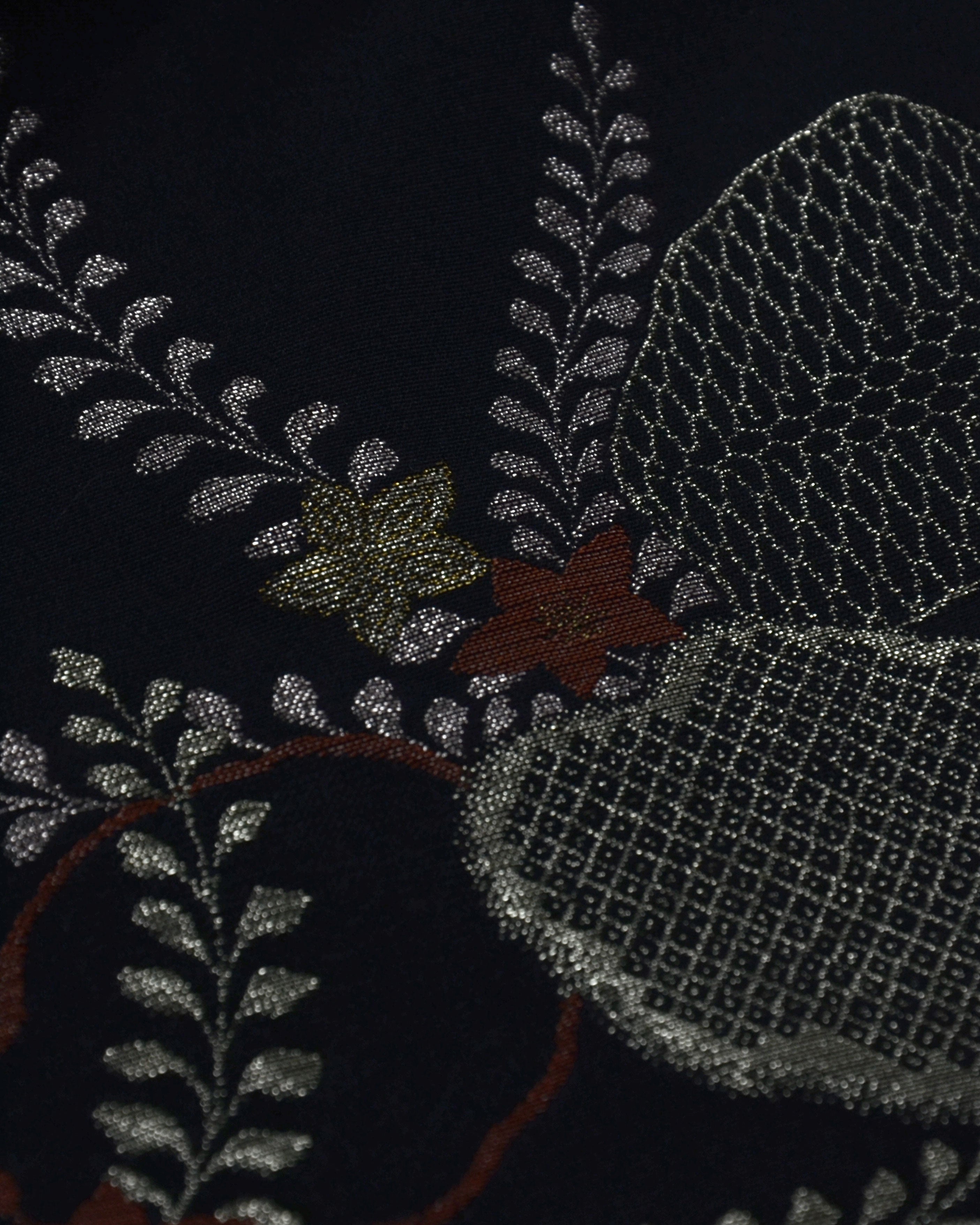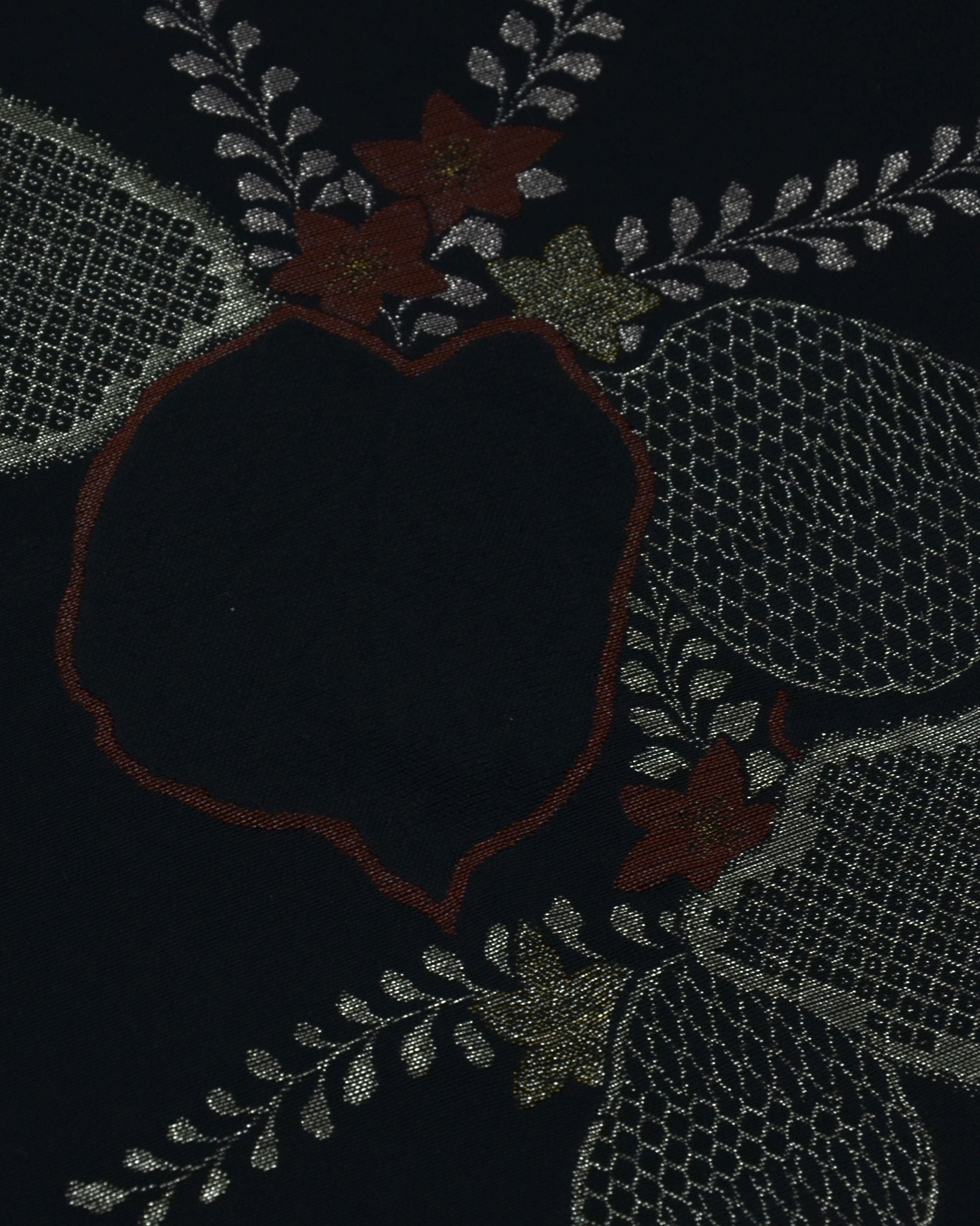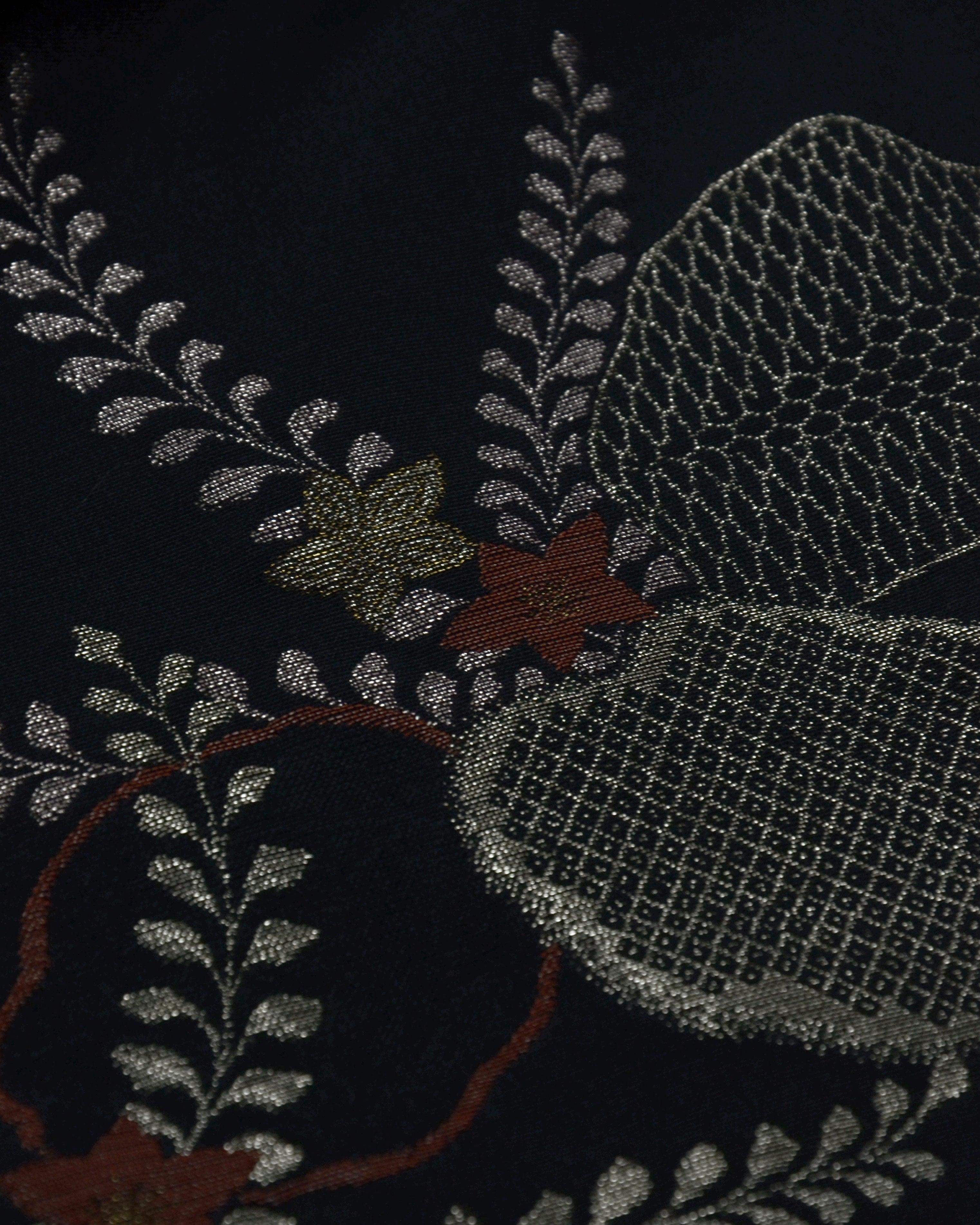 Der schwarze Stoff ist kunstvoll mit gold- und farbigen Fäden bestickt, wobei drei Ahornblätter als Hauptmotiv dargestellt sind. Kleine zusätzliche Blätter schmücken die obere Partie und verleihen dem Design einen harmonischen Akzent.