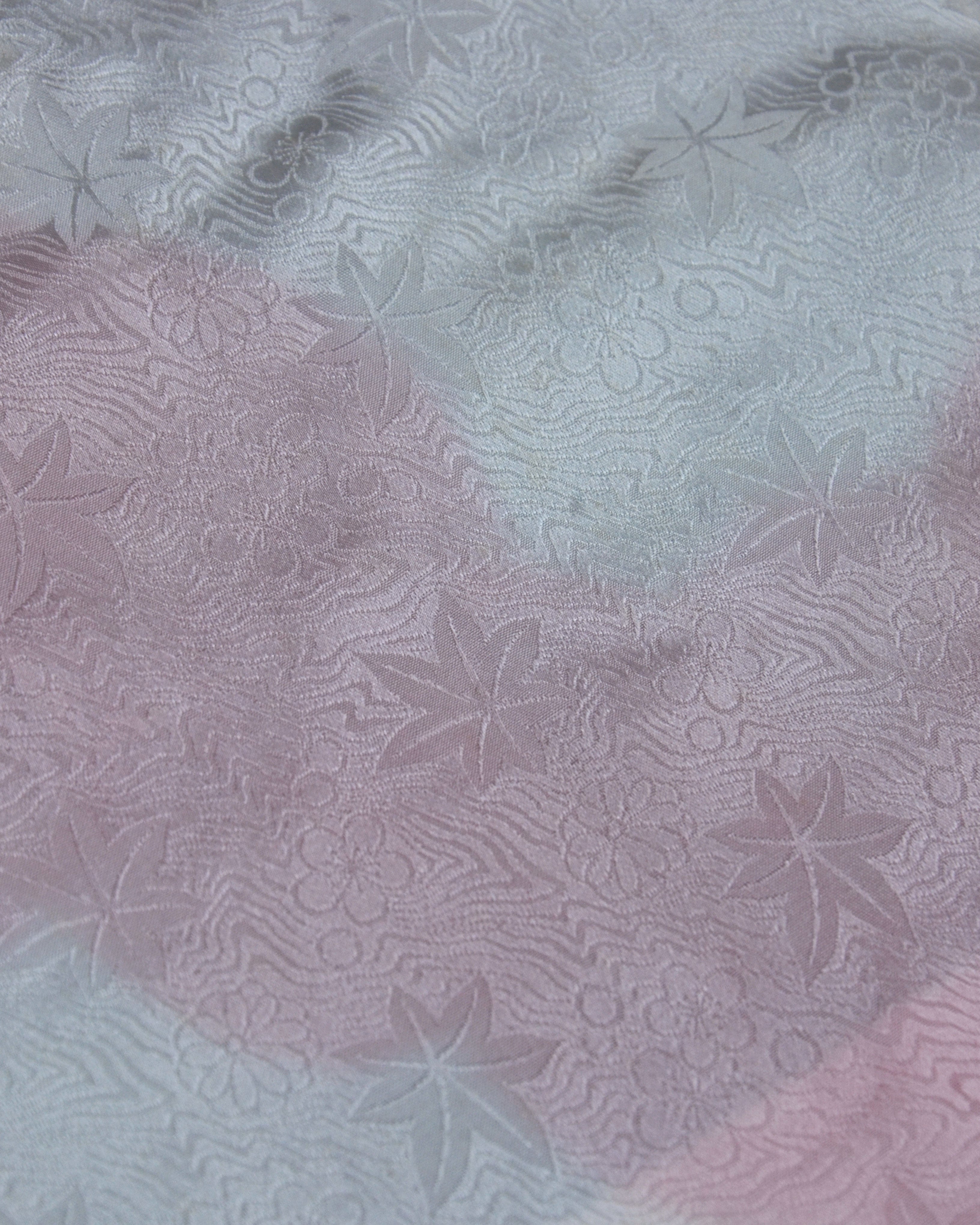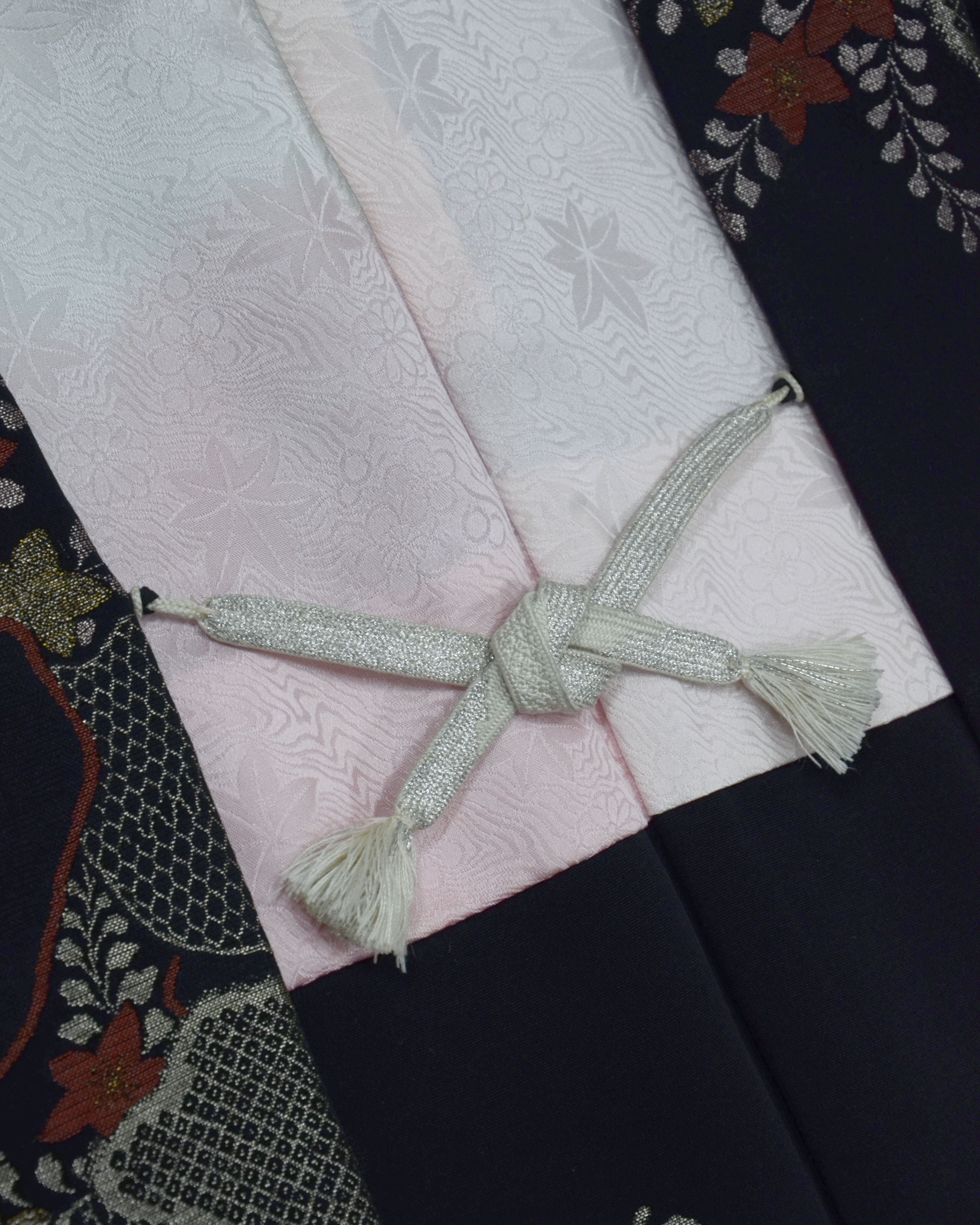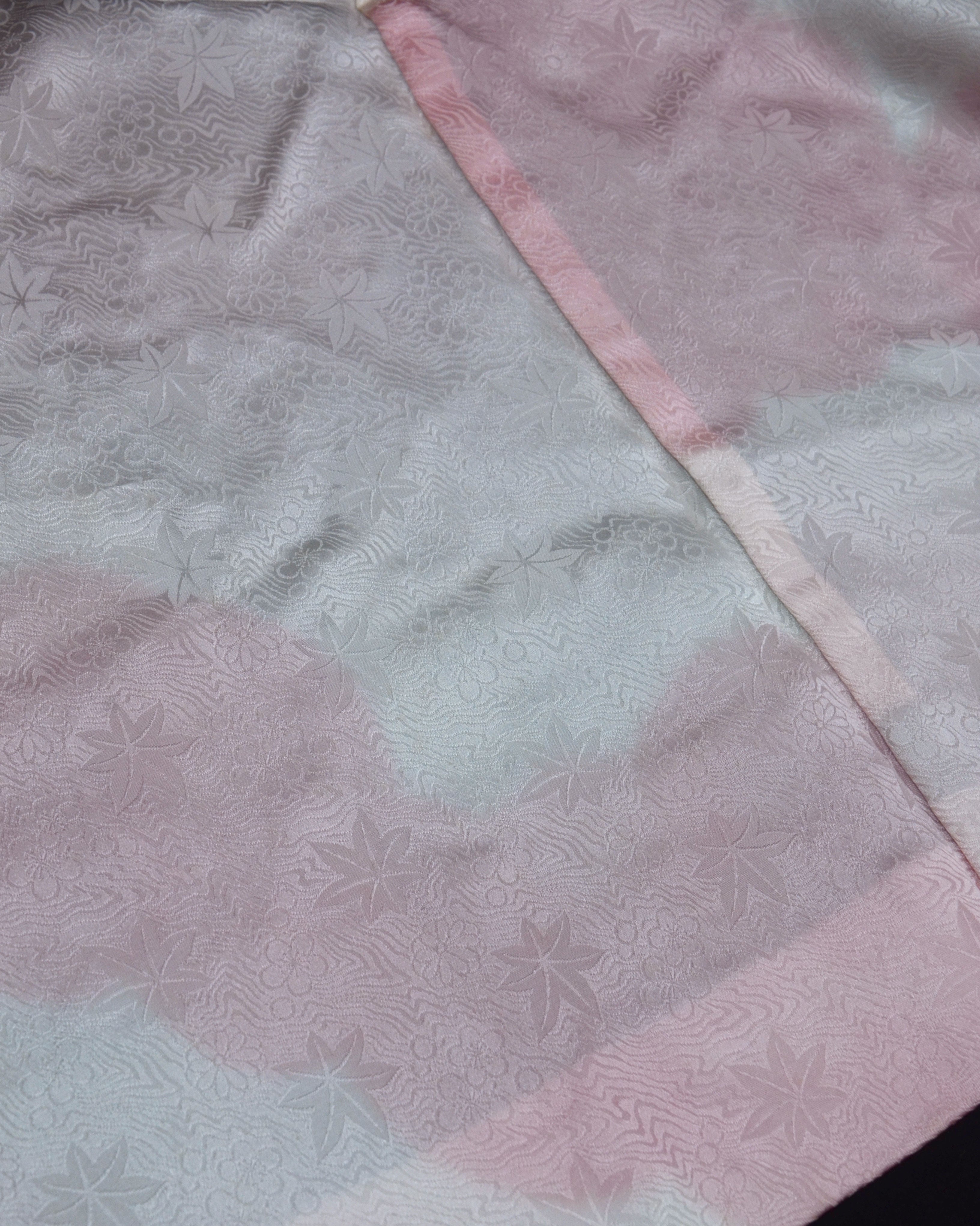Das Futter zeigt ein weißes Grundmuster mit rosa Wellen, durchzogen von kleinen Ahorn- und Kirschblüten – ein elegantes Detail, das saisonale Schönheit und klassische japanische Ästhetik vereint.